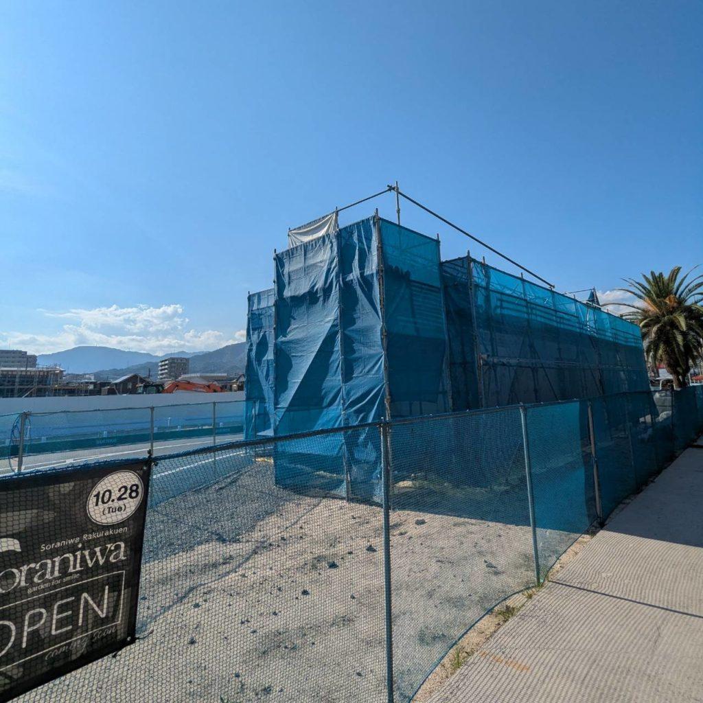 広島市佐伯区のショッピングセンター「イオンタウン楽々園」にて、新しいお店の建設工事が進められています。